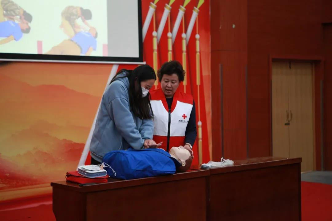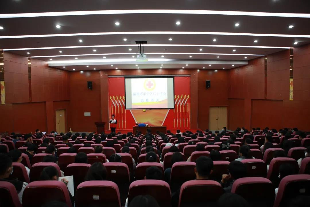 济南市市中区红十字会刘蓉老师作为主讲老师,为帮助大家更好的了解急救知识,使同学们初步掌握急救、自救、互救的基本技能知识和关键性的初级救助实践操作,刘蓉老师用PPT演示、真实事例讲解等方式,让同学们能够在关键时刻更好的自救互救,做到科学施救,给自己、家庭和他人的幸福生活多一份安全保障。