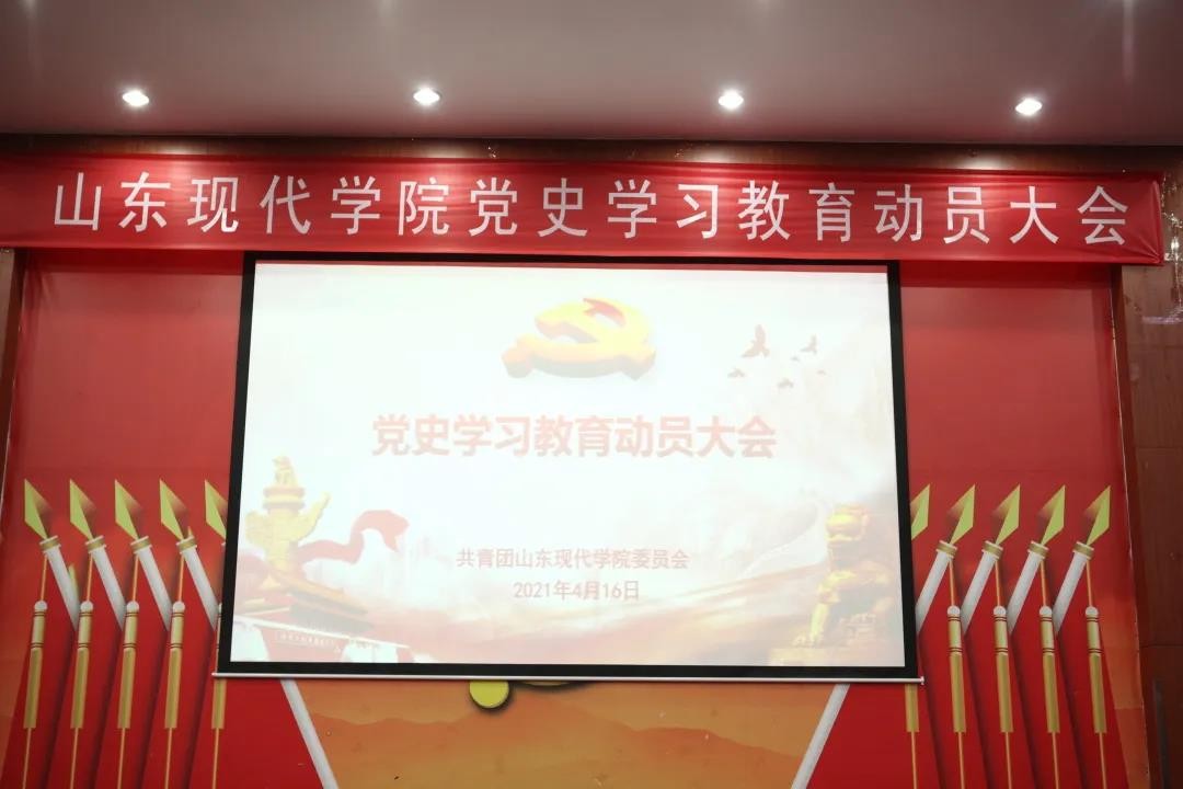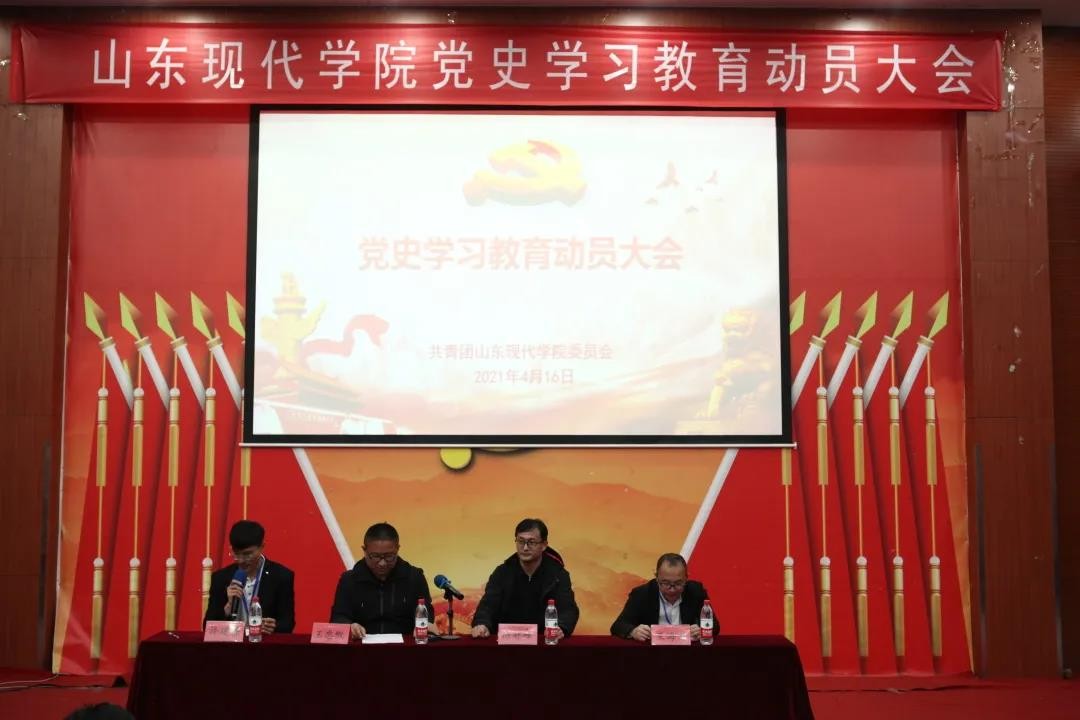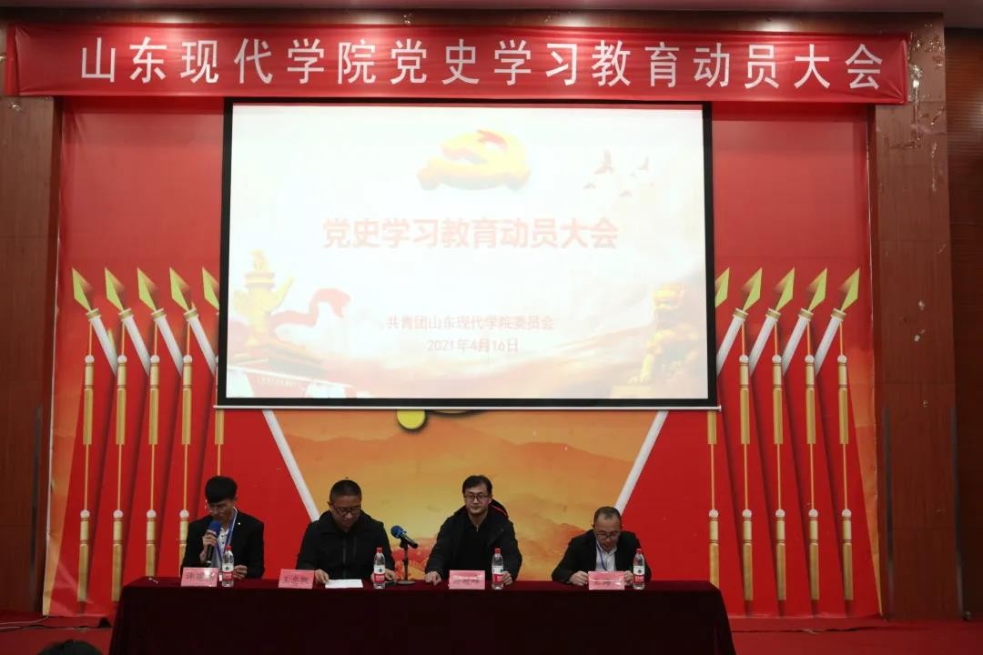 2021年4月16日,山东现代学院召开党史学习教育动员大会,全体与会人员在大会上认真学习习近平总书记讲话精神,紧跟时代步伐,学习党的历史,传承党的精神。