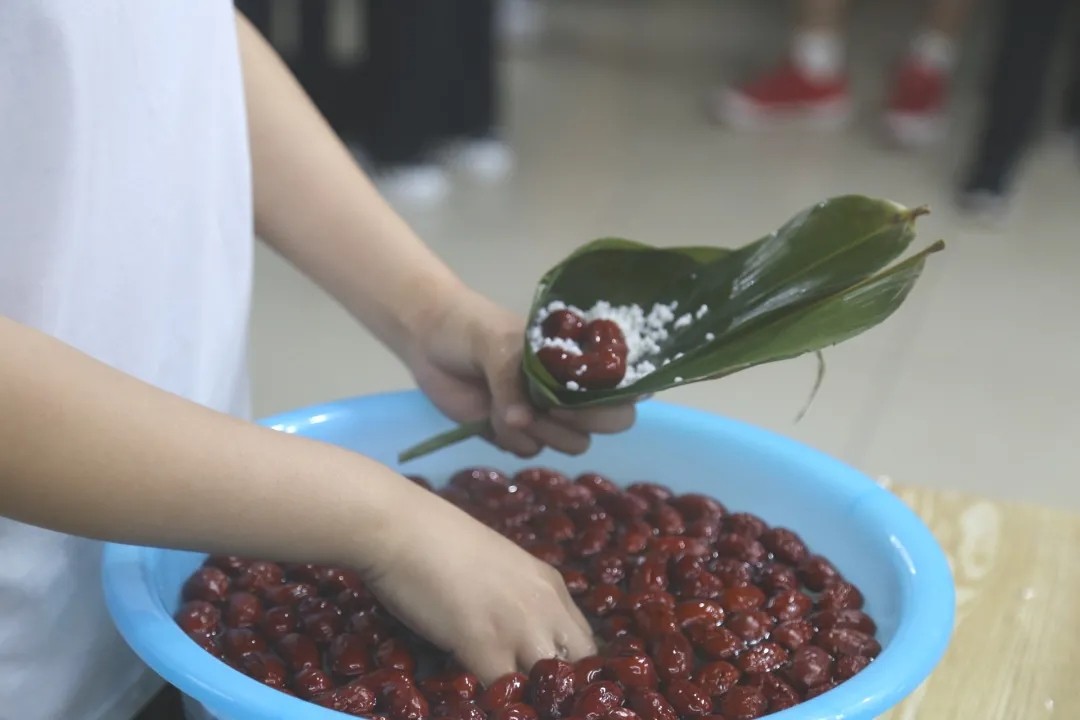 随后,在一位包粽子小能手的演示下,师生代表们纷纷洗净双手,撸起袖子,按捺不住想要一试身手的心,急切的拿起后勤工作人员早已准备好红枣、糯米、粽叶、细绳等原材料,开始了今天的包粽子活动。一片,两片,三片,交错叠加,加入糯米、蜜枣,一手紧握粽子,一手缠着棉线。