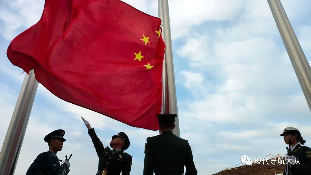 国旗护卫队身着整齐军装,迈着英武步伐,护卫着国旗走向升旗台。伴随着雄壮的国歌声,鲜艳的五星红旗冉冉升起,在场的全体师生齐唱国歌,立正向国旗行注目礼。