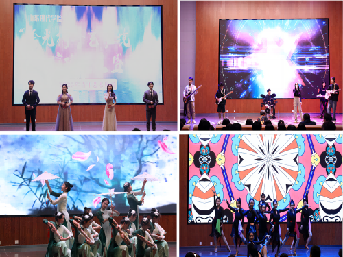 由共青团山东现代学院委员会主办、大学生艺术团承办的“拾光携手艺家境·璀璨共度盛开时”2023年五四青年节艺术展演活动于5月11日在图书馆报告厅如约举办。在这个青春飞扬的五月,同学们用艺术表达青春热忱,用艺术赞美接续奋斗,用艺术描绘新的篇章,艺家人携手相约,共度璀璨盛开之时!华灯初上夜未央,现代嘉人聚一堂。《光熠青春》、《雨涧春行图》、《敕勒歌》、《戈壁沙丘》、《是妈妈是女儿》、《致姗姗来迟的你》、《奇妙物语》等节目精妙绝伦,引人入胜。举办前,演员和幕后工作者反复练习,一次次排练,只为呈现出最佳的演出效果。举办中,他们一丝不苟、严谨认真,随时关注舞台情况。今宵纵有千万语,高朋满座言不尽。大家共聚一堂,谱出一曲相逢的歌。青云万里,初心未眠,拾光携手,共赴未来!