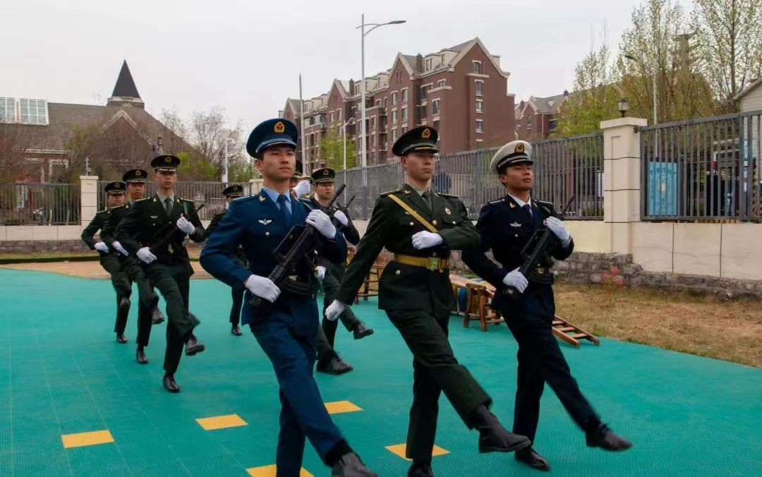 升旗仪式终于开始了,仪仗队队员昂首挺胸,迈着有力、整齐的步伐,走到了旗杆两旁。