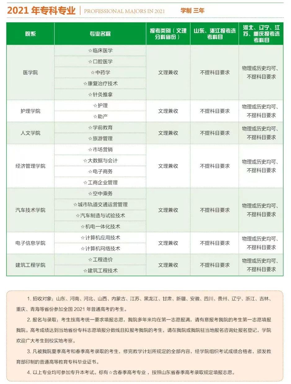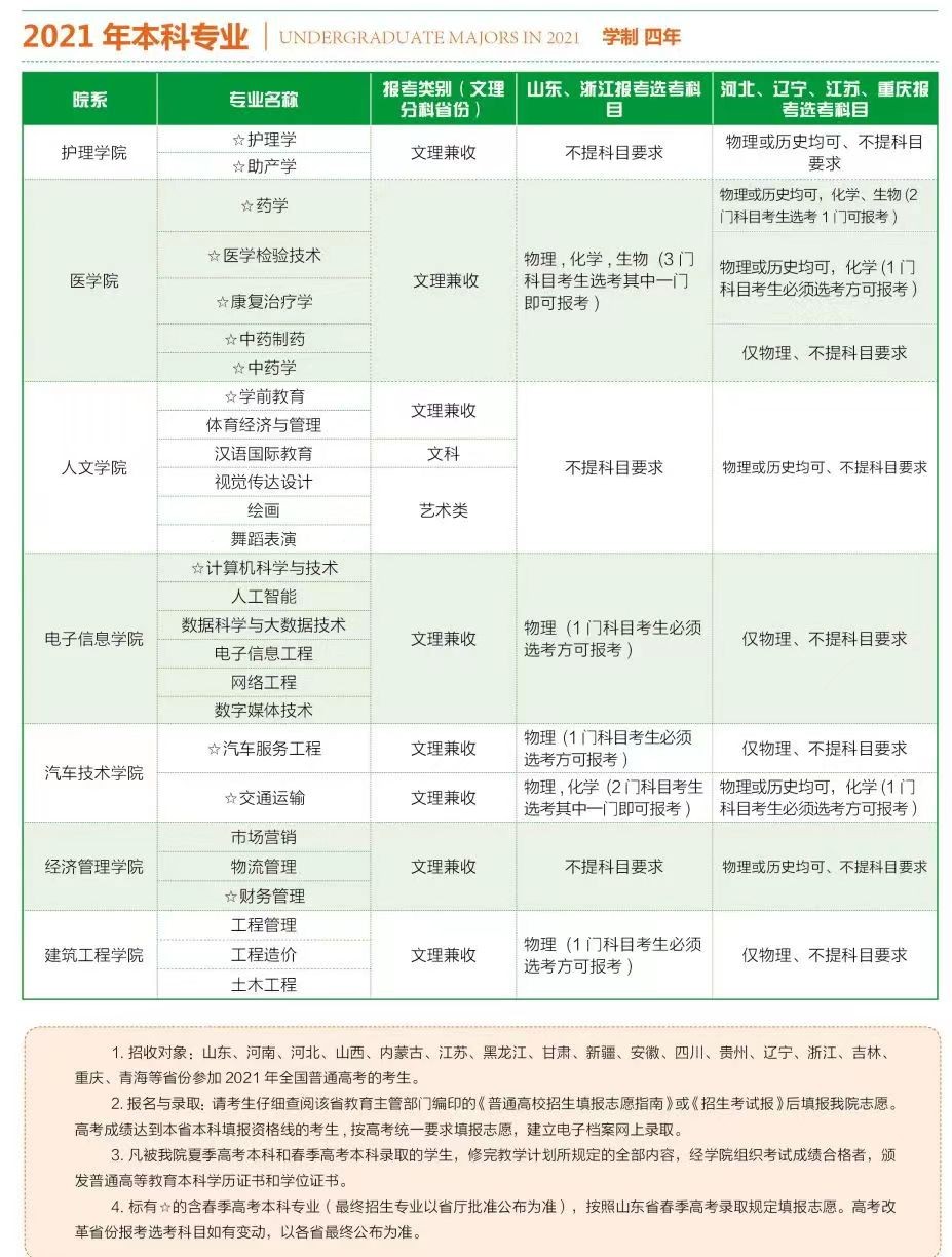 学院开设了护理学、助产学、康复治疗学、药学、医学检验技术、中药制药、中药学、学前教育、体育经济与管理、汉语国际教育、视觉传达设计、绘画、舞蹈表演、计算机科学与技术、人工智能、数据科学与大数据技术、电子信息工程、网络工程、数字媒体技术、市场营销、物流管理、财务管理、汽车服务工程、交通运输、工程造价、土木工程、工程管理等27个本科专业和21个专科专业。27个本科专业均属于学院优势专业,并且多属于山东省乃至全国紧缺热门专业。