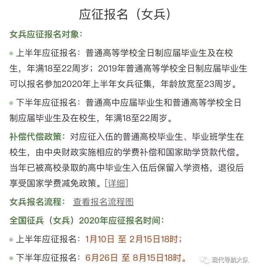 女青年:2020年年满18至22周岁,上半年征集的2019年普通高等学校全日制应届毕业生放宽至23周岁。