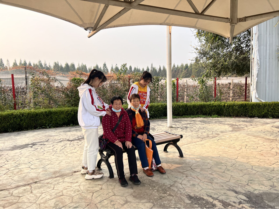 经过一个多月的专业知识学习,同学们学会了一些按摩手法,主动给长椅上休息的老人按摩,陪他们聊天,充分发扬了“老吾老以及人之老”的优良传统。