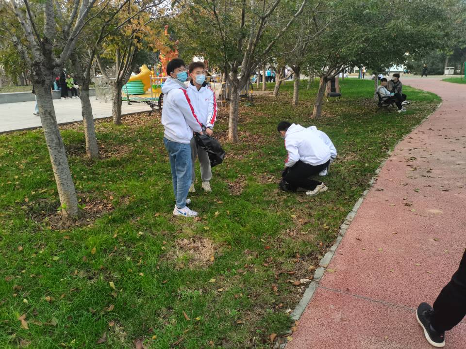 金秋十月,碧空如洗。在行进过程中,同学们看到环卫工人辛苦的劳作,便停下前进的步伐,帮助清理草丛里的垃圾,日行一善的自觉性,为秋日更添一份独特的魅力。