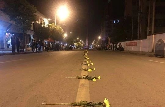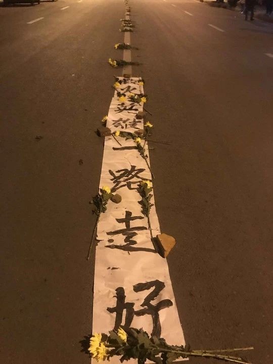 路面上摆放着菊花,写着挽言:救火英雄一路走好。