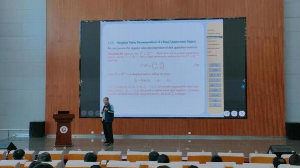 演讲报告阶段, 由香港理工大学祁力群教授和香港大学 Michael K/ Ng 教授分别围绕本次会议的主题, 以不同的角度展开了四元数矩阵计算及其应用的讲解答疑。会议现场热情高涨,专家、教授以及山东现代学院的学子们积极提问,交流互动。