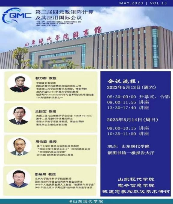 天气晴朗,惠风和畅。在山东现代学院迎来三十周年校庆之 际,第三届四元数矩阵计算及其应用国际会议于 2023 年 5 月 13日在山东现代学院图书馆一楼报告大厅顺利举行。