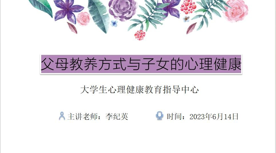 为了进一步加强我校学生的心理健康教育,在学生以及家长中普及心理健康知识,更好地引导家长关注学生的身心健康发展,把握家庭教育的方向,大学生心理健康教育指导中心组织二级学院开展了以“父母教养方式与子女心理健康”为主题的线上家长会。