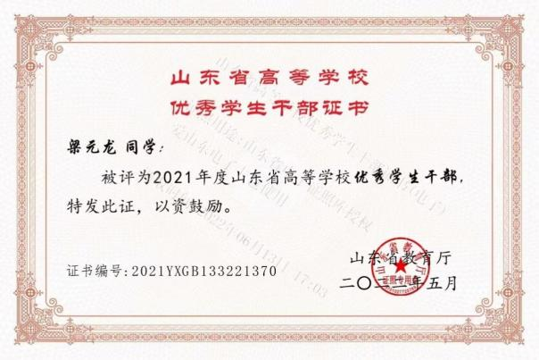 梁元龙,男,汉族,2000 年 3 月生,中共党员,是工学院 2019级本科交通运输 1 班的学生。曾多次获奖项与荣誉:“美育立德行 ” 绚丽华年第十四届全国美育教学成果展评二等奖;2021 年山东省“ 同心防溺水 ”安全宣传教育作品征集评选活动一等奖;2021 年山东省青少年模拟政协提案征集活动大学组三等奖;山东省高等学校优秀学生干部等荣誉。