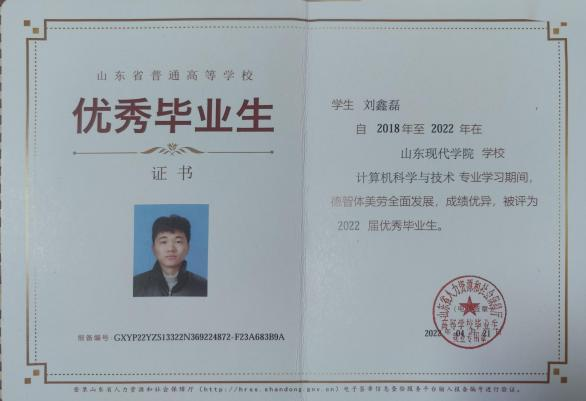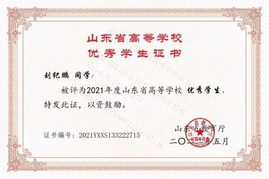 刘纪鹏,男,汉族,中共党员,山东现代学院电子信息学院 2019 级本 科计算机科学与技术专业 4 班学生,在校期间曾荣获山东省高等学校优秀学生荣誉称号。