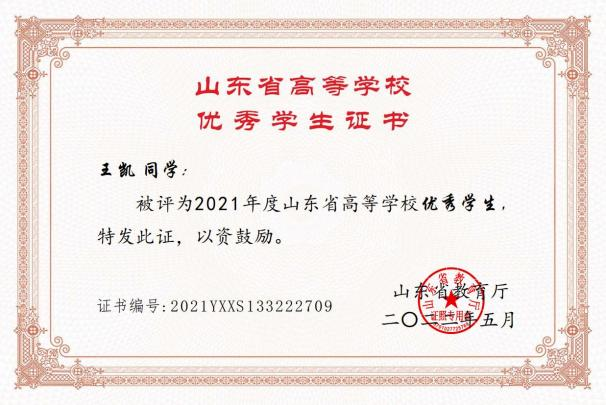王凯男,汉族,中共党员,电子信息学院 2019 级本科数字 媒体技术专业学生。曾被评为 2022 年省级优秀学生。曾获得“2019年新声力量山东省大学生合唱艺术节” 三等奖。王凯同学平时勤奋刻苦,学习成绩优异,注重与老师们、 同学们交流学习,积极参加校内外各种活动,具有扎实的专业知识。