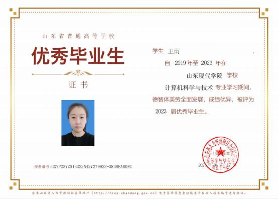 王雨,女,汉族, 中共党员, 电子信息学院 2019 级本 科计算机科学与技术专业学生。被评为 2023 届山东省普通高等学校优秀毕业生。