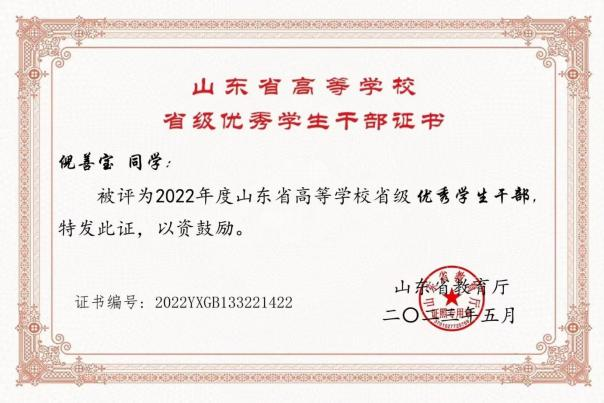 倪善宝,男,满族,共青团员, 电子信息学院 2021 级 专科计算机应用技术 2 班学生,荣获山东省优秀学生干部。 山东现代学院第八届导航员,荣获全国美育铸创新 ·绚丽年 华第十六届全国美育教学成功展评一等奖、国家级机器人大 赛优胜奖、校级 2021 级军训标兵称号,荣获 2022 年-2023年 “爱党爱国爱校先进学子”称号。