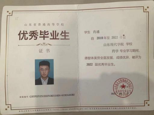 肖通,男,汉族,于 2000 年 5 月出生,中共党员,山东现代 学院医学院 2018 级本科药学 1 班学生,在校期间任班级班长和医 学院学生会副主席, 曾获得 2019-2020 学年山东省政府奖学金, 2020 年 8 月荣获省级优秀学生荣誉称号,2020 年 12 月荣获第十 五届全国高等职业院校发明杯大学生创新创业大赛三等奖。现工作于济南市商河县人民医院药剂科。