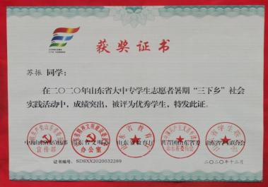 “ 功崇惟志,业广惟勤” 的学习态度。一方面,该生认真学好 专业知识,课堂上没听懂的内容,及时向老师、 同学请教,趁热 打铁式的掌握、抓牢学过的知识。 以期中、期末等阶段测试为重 要抓手,主动总结、复习、归纳学习成果。另一方面,利用好课 余时间,积极参加比赛活动,既锻炼实践操作能力,又提高团结 协作意识,并在比赛中取得山东省防溺水安全宣传活动一等奖、 山东省移动互联创新创业大赛三等奖、山东省第二届医养健康创新创业大赛三等奖等奖项和荣誉。