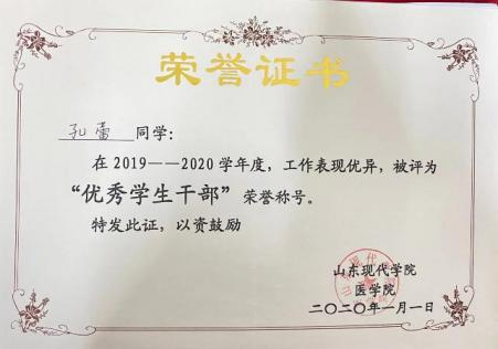 孔蕾,女,汉族,1999 年 1 月出生,中共党员,药学院 2018 级本科中药制药 2 班。曾获得 2020 年度“ 泉城奖学金”,2019 年度 山东省高等学校优秀学生,第十五届全国高等职业院校“ 发明杯” 大学生创新创业大赛三等奖,积极参加志愿活动,志愿汇时长达 到 87.2 小时,被评为 2019 年度山东现代学院优秀共青团员、2019 年度医学院优秀学生干部。在校期间担任医学院学生会副主席和班级团支书职务。2022 年 9 月考入滨州市无棣县中医院。