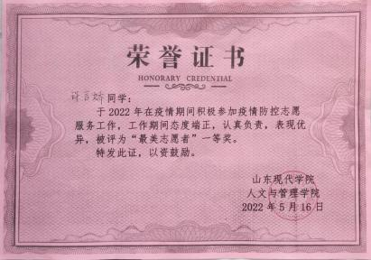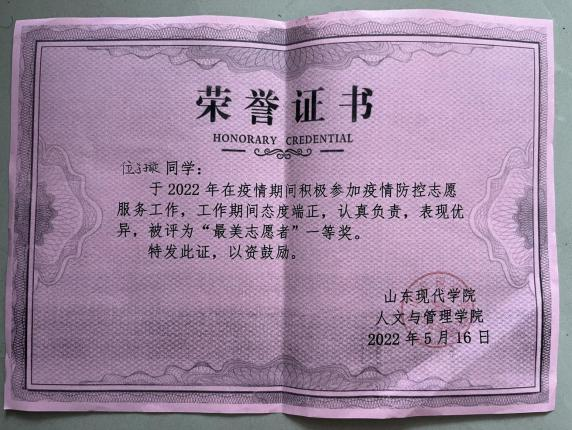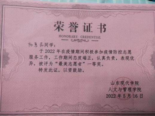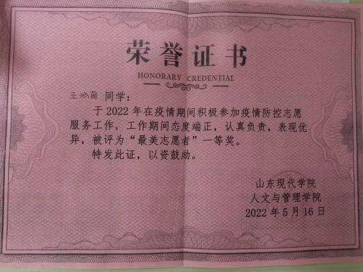 在疫情期间,于玮作为学生会成员毅然决然地肩负起自 己的使命, 自愿到疫情防控点值班,为同学们送餐送水,协助老师们与疫情作斗争,荣获学院 “最美志愿者”一等奖。