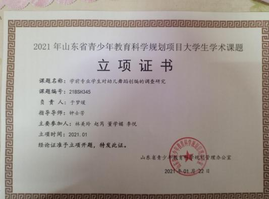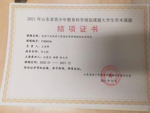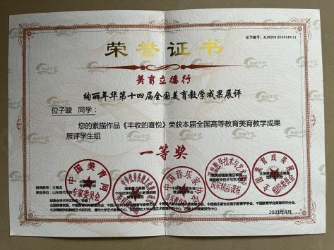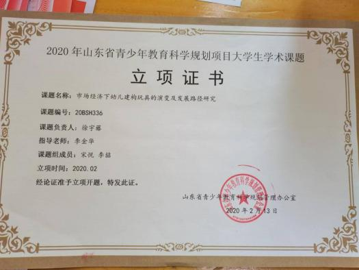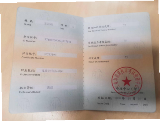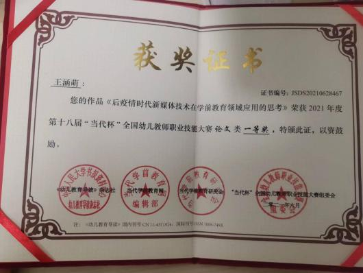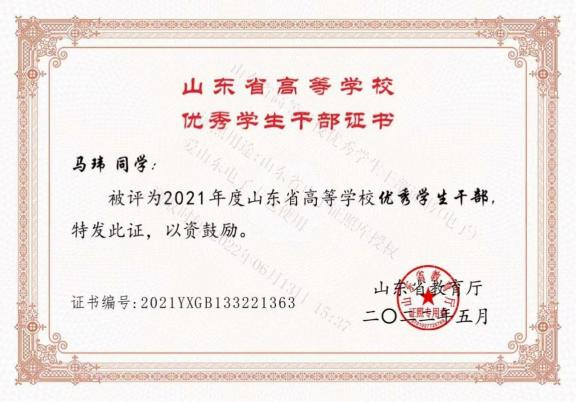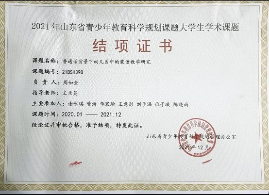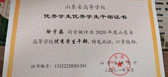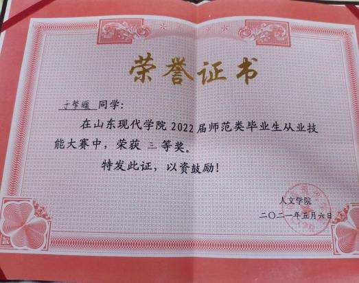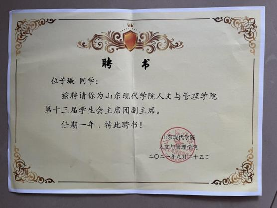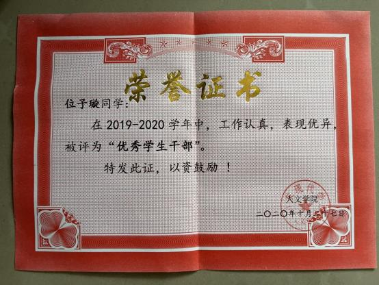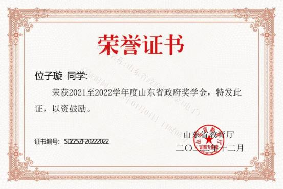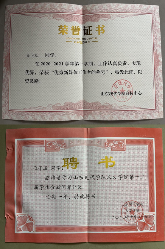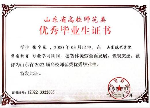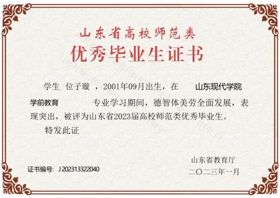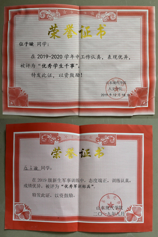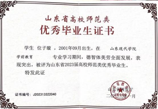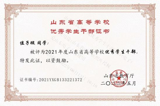 此外,位子璇在校内表现积极,2019 年被评为“优秀军训标 兵” 、2019-2020 学年获得了 “优秀学生干部” “优秀学生 干事”、2020-2021 学年获得 “优秀新媒体工作者”的称号、 2022 年荣获山东省政府奖学金,并相继通过了儿童高级教育指导师、幼儿园教师资格证、普通话二级甲等测试。
