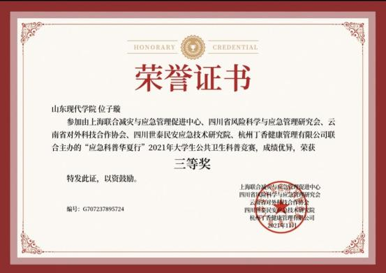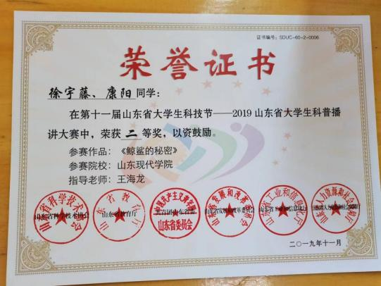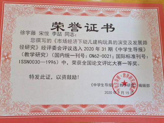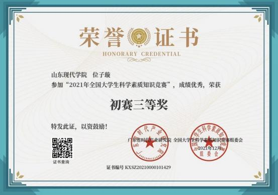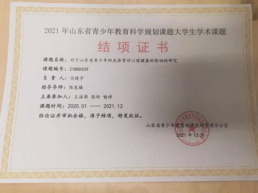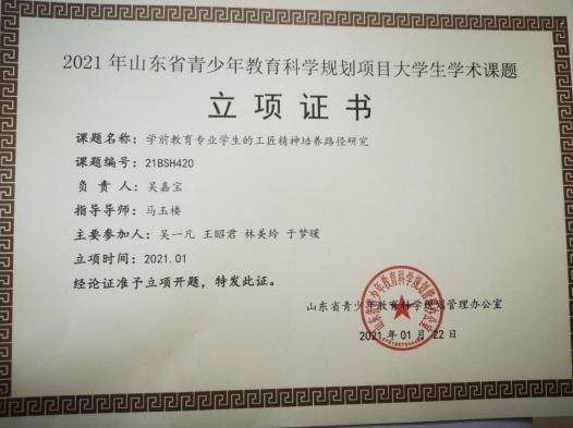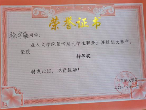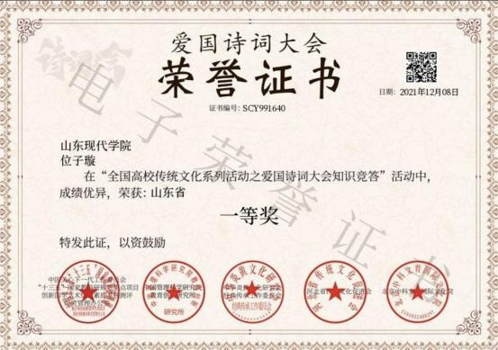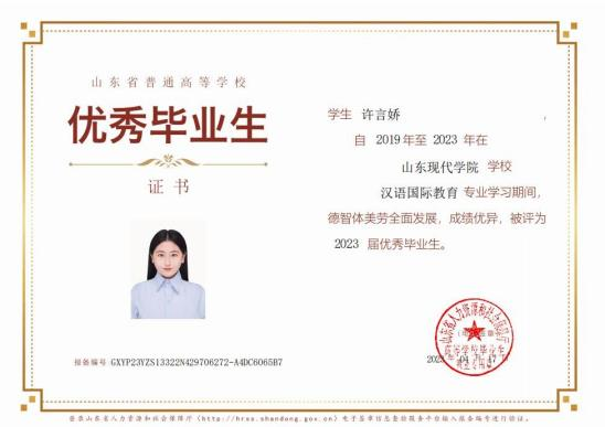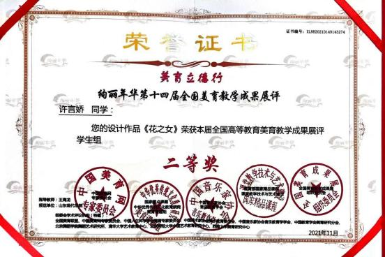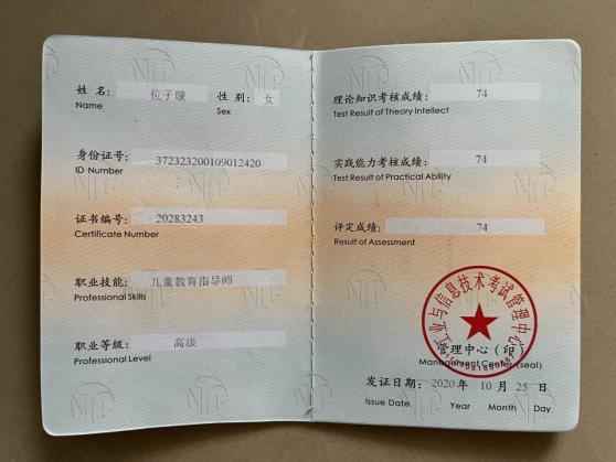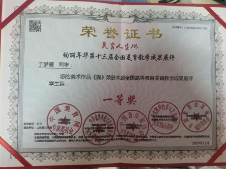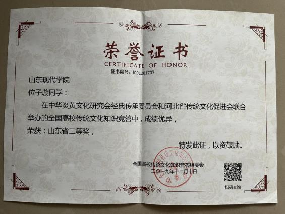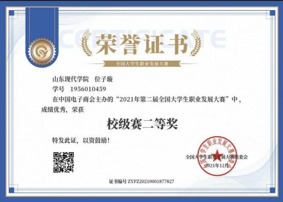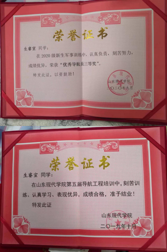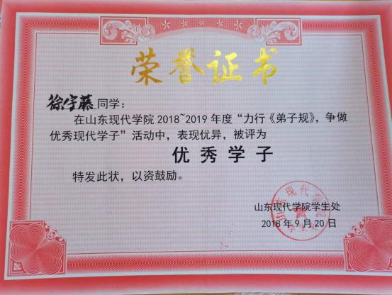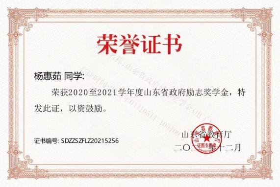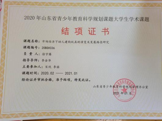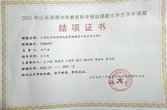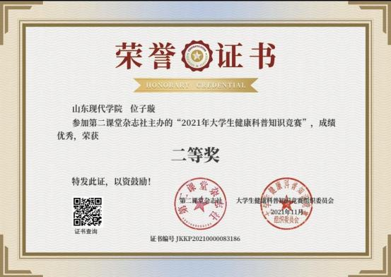 此外,位子璇在校内表现积极,2019 年被评为“优秀军训标 兵” 、2019-2020 学年获得了 “优秀学生干部” “优秀学生 干事”、2020-2021 学年获得 “优秀新媒体工作者”的称号、 2022 年荣获山东省政府奖学金,并相继通过了儿童高级教育指导师、幼儿园教师资格证、普通话二级甲等测试。