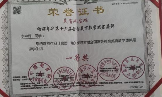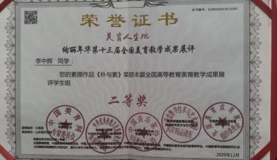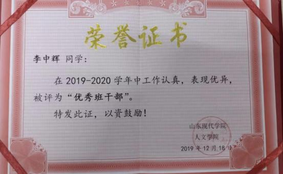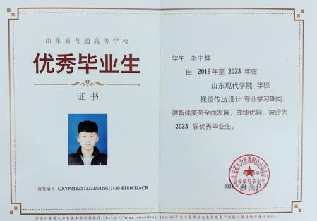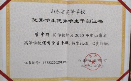 李中辉,男,汉族,2023 年 5 月 11 日出生,中共党员, 人文与管理学院 2019 级本科视觉传达设计 2 班班长。 自入 校以来曾获得国家励志奖学金、省级优秀学生干部、2023 届 省级优秀毕业生、2019-2020 学年 “优秀班干部” 、2020 年 “优秀导航员一等奖” 、2020 年第 12 届山东省大学生科技 节鲁南制药杯三等奖等、2020 年绚丽年华第 13 届全国美育教学成果展评一等奖、二等奖。