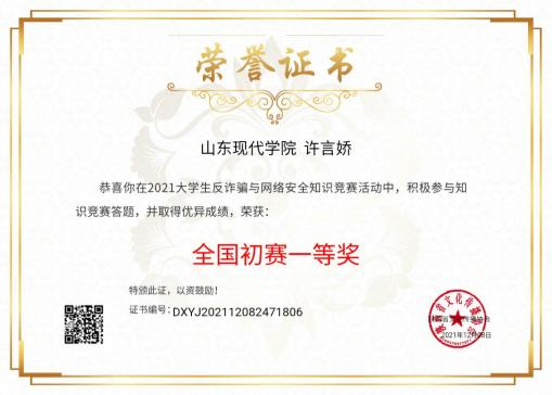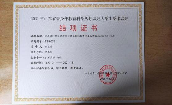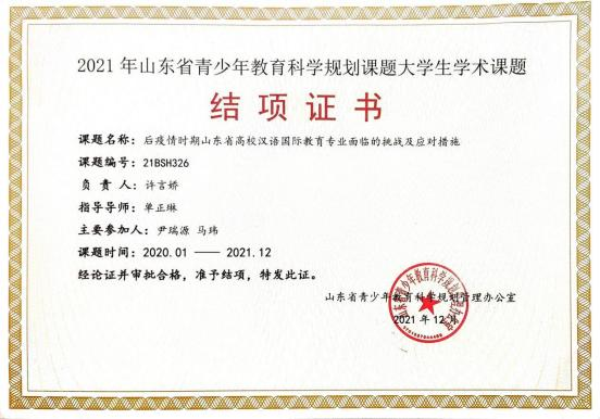 许言娇,女,汉族,2000 年 10 月生, 中共党员,人文 与管理学院 2019 级本科汉语国际教育班学生。 曾任人文与管理学院学生会主席,2019 级本科汉语国际教育班班长。2020 年获得“十三届全国美育教学成果展评”学生组一等奖、 2020 年在“第十二届山东省大学生科技节— —‘鲁南制药杯’首届山东省大学生医养健康创新创业大赛” 中荣获二等奖、2021 年获得“十四届全国美育教学成果展评”学生组一等奖、 2021 年在“反诈骗与网络安全知识竞赛”中获全国初赛一等 奖,在校期间,分别于 2021 年 12 月、2022 年 12 月两次获 得国家励志奖学金,于 2022 年 5 月获得 “ 山东省高等学校 优秀学生干部”、2023 年 4 月获得“ 山东省普通高等学校优 秀毕业生”荣誉称号,2021 年 1 月-12 月主持参加山东省教 育规划课题大学生学术课题立项并结项、获得全国美育教学成果展评一等奖两次、二等奖两次。