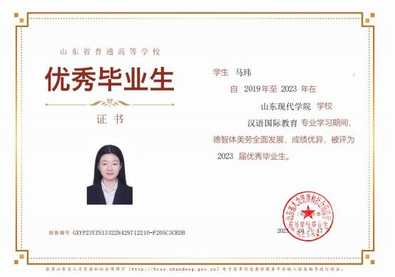 马玮,女,汉族,2001 年 4 月生,人文与管理学院 2019 级本科汉语国际教育专业学生,中共党员,曾担任人文与管 理学院学生副书记。2020 年在“第五届大学生预防艾滋病知 识竞赛”中荣获优秀奖、2020 年在“第十二届山东省大学生 科技节— — ‘鲁南制药杯’首届山东省大学生医养健康创新 创业大赛”中荣获二等奖、2020 年在“第十三届全国美育教 学成果展评”学生组荣获一等奖、2021 年在“十四全国美育 教学成果展评”学生组荣获一等奖、2021 年在“ 山东省‘ 同 心防溺水’安全宣传教育作品征集评选活动”中荣获三等奖。 在校期间,于 2022 年获 “ 山东省高等学校优秀学生干部”、 2023 年获” 山东省优秀毕业生”称号,在 2021 年完成 “后 疫情时期山东省高校汉语国际教育专业面临的及应对措施”的立项与结项。