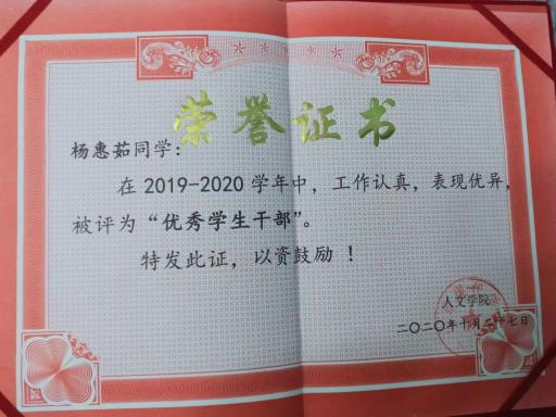 在工作上,曾担任学院学生会学习部部长,以勤勉进取 的积极态度,全方位充实锻炼自己,积极参加并组织学院各 项活动,如演讲比赛、朗诵比赛、迎新活动等,多次参加学 校及学院的志愿者服务活动;在班级中,曾担任团支书一职, 组织学生参与各项团日主题活动,进行学生思想政治工作,协助班长和辅导员进行班级管理工作。在疫情期间,杨惠茹积极参加疫情防控志愿者服务工作,在 2022 年被评为 “最美志愿者”一等奖。