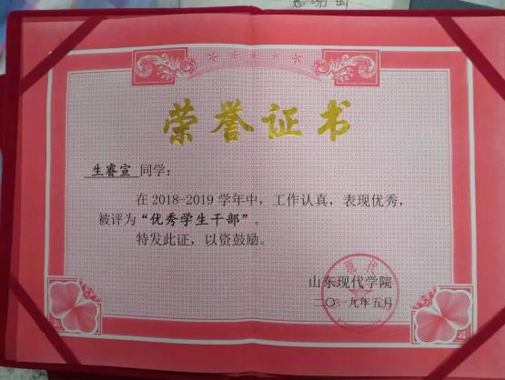 在工作中,生睿宣积极配合老师的各项工作,担任班级 班长和学院里行政部部长,在老师与同学之间发挥桥梁作用, 热心帮助同学们解决困难,配合指导员工作,带领班级获“优秀班级”荣誉。