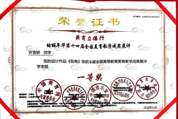 在学习上,许言姣努力学习专业知识和技能,在校期间 取得优异成绩,积极参加各项考试,考取各类资格证书。 自觉将知识用于实践中,多次参与各类比赛并取得相应成绩。