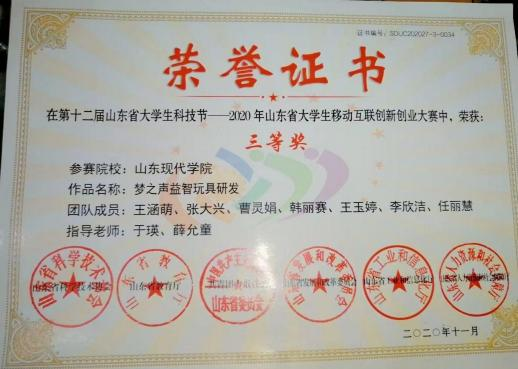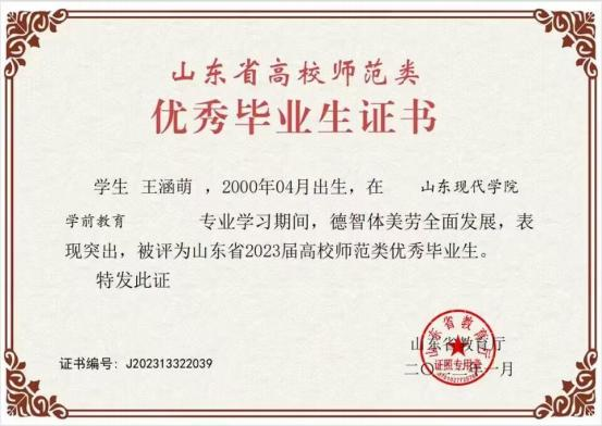 王涵萌,女,汉族, 2000 年 4 月生, 中共党员,人文 与管理学院 2019 级本科学前教育 2 班。2019 年 1 月在 “传 承国学经典 ·诵读华夏文明”诵读比赛中荣获三等奖、2021 年 6 月,凭借论文《后疫情时代新媒体技术在学前教育领域 应用的思考》,荣获 2021 年度 “ 第十八届 “ 当代杯”全国 幼儿教师职业技能大赛论文类” 一等奖、2021 年 11 月在创 业项目 “梦之声益智玩具研发”,荣获 “第十二届山东省大 学生科技节—— 山东省大学生移动互联创新创业大赛”三等 奖、2021 年 12 月,凭借课题《对于山东省青少年阳光体育 对心理健康的影响的研究》,荣获 2021 年 “ 山东省青少年 教育科学规划课题大学生学术课题”结项证书、2021 年 12 月,凭借课题《疫情下在线学习资源在学前领域的应用研究》, 荣获 2021 年 “ 山东省青少年教育科学规划课题大学生学术 课题”结项证书。在校期间表现突出,荣获 “ 山东省 2023届高校师范类优秀毕业生”称号。