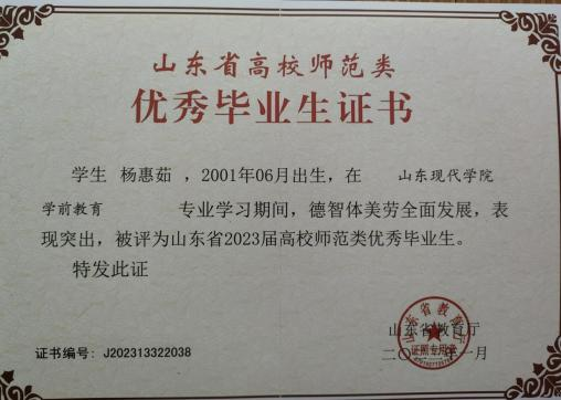杨惠茹,女, 中共党员,人文与管理学院 2019 级本科 学前教育 2 班,曾任人文与管理学院学生会学习部部长,班 级团支书。2019 年在“第十二届全国美育教学成果展评”中 荣获“二等奖”、2020 年在“第十三届全国美育教学成果展 评” 中荣获 “一等奖” 、在 2020-2021 学年获得山东省省政 府励志奖学金,在校期间,杨惠茹被评为 “优秀团干部” 、 “优秀学生干部” 、 “2023 届山东省优秀毕业生”等奖项, 考取了 “儿童教育指导师” “ 营养指导师” “健康管理师”“幼儿教师资格证”等证书。