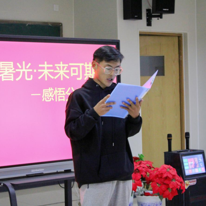 接下来,七位同学分别上台进行了分享。第一位同学讲述了他参加志愿者活动的经历。他谈到,这次经历让他明白教育的真谛,并收获了人与人之间最真挚的情感。第二位同学则分享了她在学习过程中如何将理论知识应用于实际生活的体验,她表示,每日反思让她明白学习的目的和意义,并激发了她对未来的职业规划的思考。最后一位同学讲述他在暑假期间提高自己综合素质的经历,他强调综合素质对于个人发展的重要性并分享自己对于未来的学习和成长的规划。