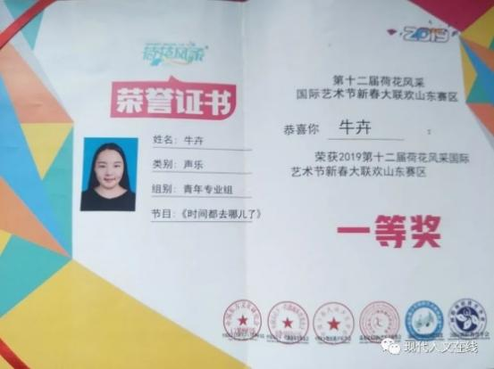 2019年,在第十二届荷花风采国际艺术节新春大联欢山东赛区中荣获一等奖;