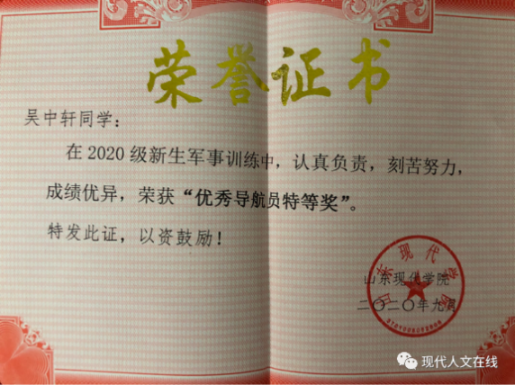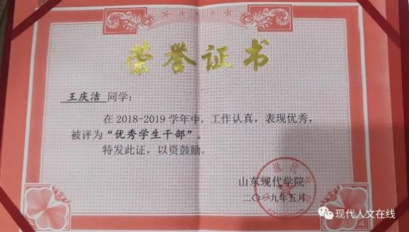 2019年4月,在山东现代学院荣获山东省高等学校优秀学生干部证书;