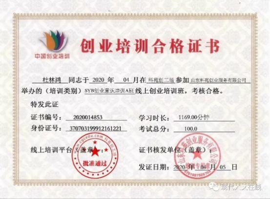 2020年6月,荣获济南市创业线上培训合格证书。
