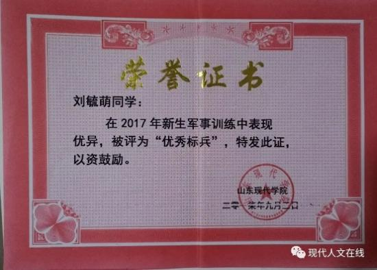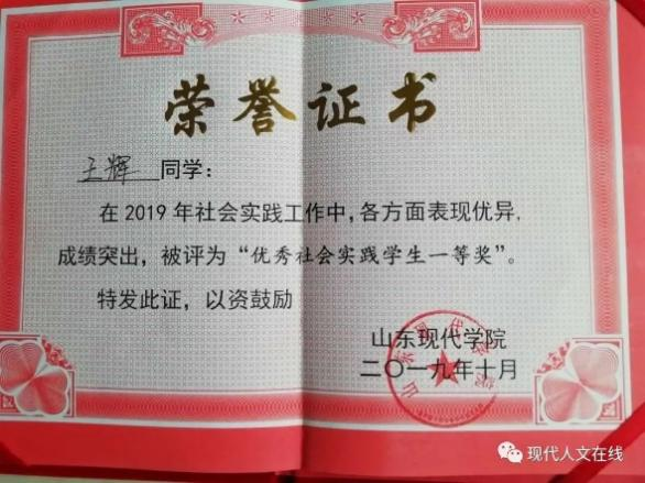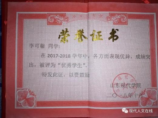 2019年3月,在山东现代学院人文学院被评为“优秀学生”;
