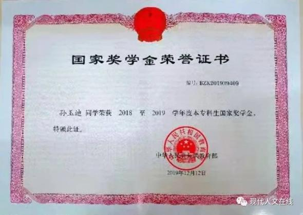 2019年,在山东现代学院获国家励志奖学金;