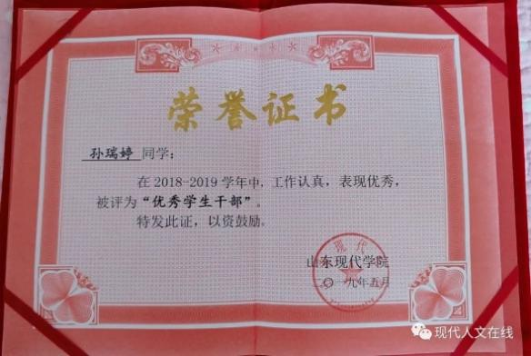 2018年,在山东现代学院人文学院被评为“优秀学生干部”;