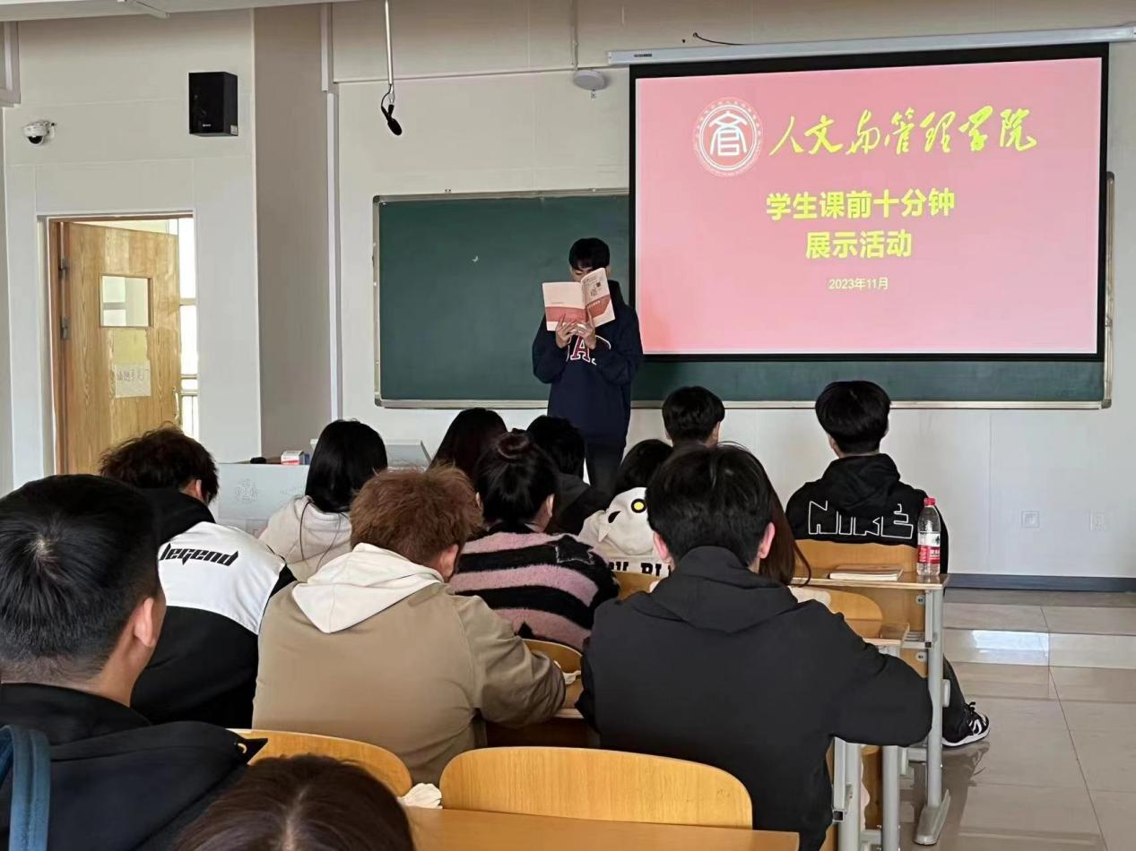 人文与管理学院自10月19日开始,坚持在班级开展课前十分钟活动。该活动调动了学生学习积极性,锻炼了学生的语言表达能力和演讲思辨能力。