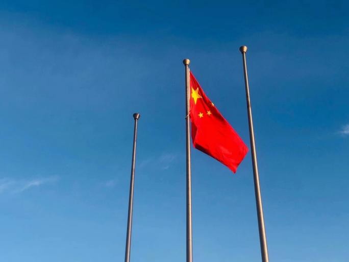 在清晨,鲜艳的五星国旗缓缓升起,耀眼而瞩目,慷慨激昂的国歌中,全体师生行注目礼。
