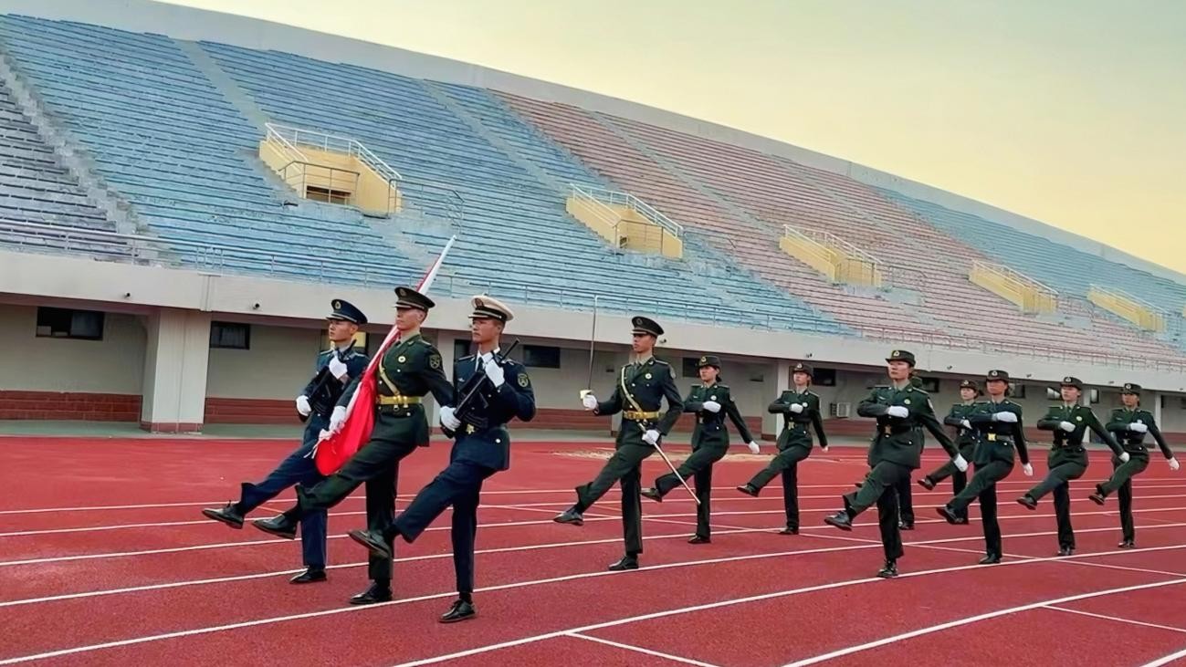 伴随着豪迈的乐曲,国旗护卫队着装整齐,英姿飒爽,迈着整齐划一、铿锵有力的步伐护送国旗入场。随后,在庄严的国歌声中,鲜艳的五星红旗沐浴晨曦,冉冉升起,迎风飘扬。全体师生面向国旗行注目礼。