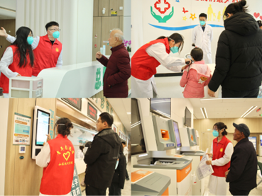 在志愿活动中,志愿者统一身着红色马甲,协助患者操作自助一体机,帮助患者正确使用预约取号、自助缴费、取检验报告单等功能,并积极解答患者提出相关的就医问题,极大地缩短了患者的就医等待时间。志愿者们热情饱满、耐心细致的服务得到了医护人员、患者及家属的肯定与赞扬,展现出现代学子的青春活力与责任担当。