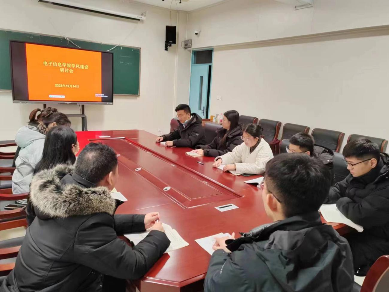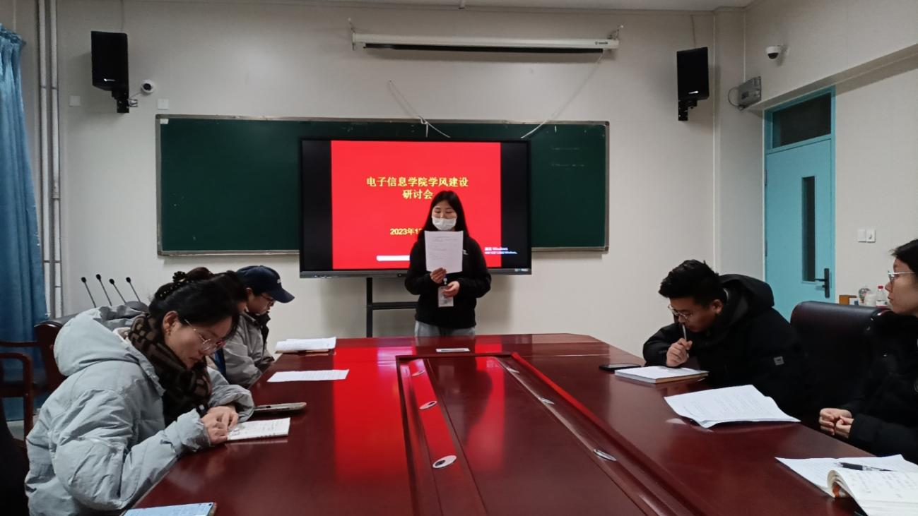 电子信息学院办公室主任张晓庆分享了关于学风建设的经验,随后,学生代表就如何建设班级班风问题展开了深刻讨论。