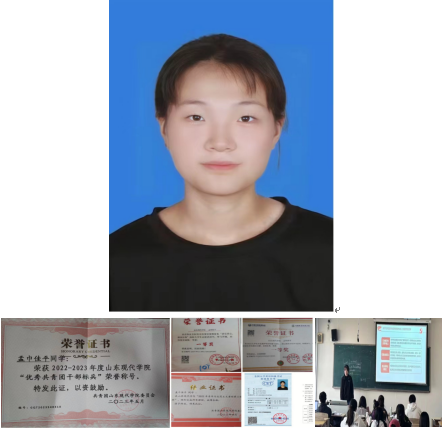个人简介:孟巾佳平,女,汉族,共青团员,2021级本科数据科学与大数据技术班。在班里担任团支书一职,负责开展主题团课活动,积极参加学校组织的活动及比赛,曾获得“全国大学生防震减灾宣传学习活动”一等奖、“全国党史故事短视频征集志愿活动”一等奖、全国大学生四级证书、青年马克思主义者培养工程培训班毕业证书等荣誉。