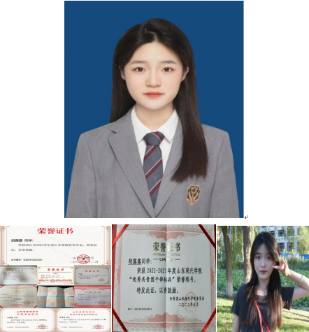 个人简介:胡露露,女,汉族,中共预备党员,2020级本科学前教育2班。曾担任校团委组织部部长,在校期间积极参加各类比赛活动,曾获得“山东省大学生移动互联创新创业大赛”三等奖、“山东省安全宣传教育作品征集评选活动”二等奖、“2021年度山东省高等学校省级优秀学生”、山东现代学院青马培训班“优秀学员”等荣誉。