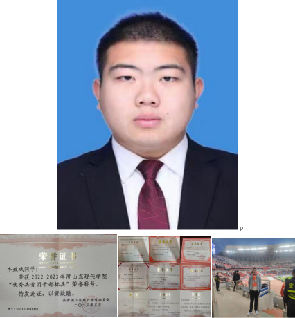个人简介:牛致斌,男,汉族,中共预备党员,2020级本科交通运输班。在班里团支部书记一职,曾任大学生艺术团主持朗诵部部长、大学生自律委员会主席,在校期间曾获得“领响生命演讲比赛暨山东省读书朗诵大赛选拔赛”一等奖、“济南市读书朗诵大赛暨第十六届全省读书朗诵大赛济南选拔赛成人业余组”二等奖、“青春心向党山东现代学院大学生庆祝建党100周年主题演讲比赛”二等奖等荣誉。