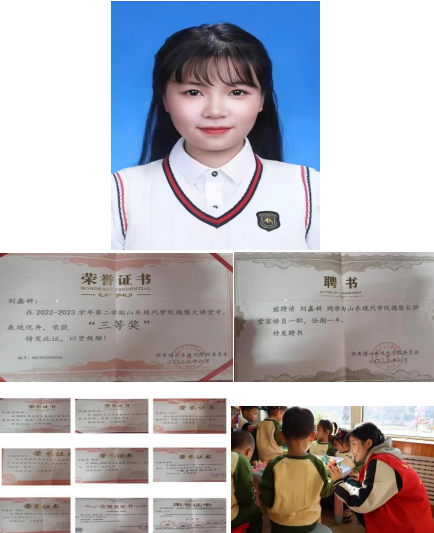 个人简介:刘鑫妍,女,汉族,2022级本科绘画1班。在班里担任班级班长一职,协助辅导员处理班级各项事务,曾获得“第十六届全国美育教学成果展评”二等奖、山东现代学院“展青年担当·扬思辨新风”一等奖、“优秀志愿者”、“优秀学生”、“优秀分列式标兵”、“优秀社会实践报告”、“军训标兵”、“最具风采现代学子”等荣誉。