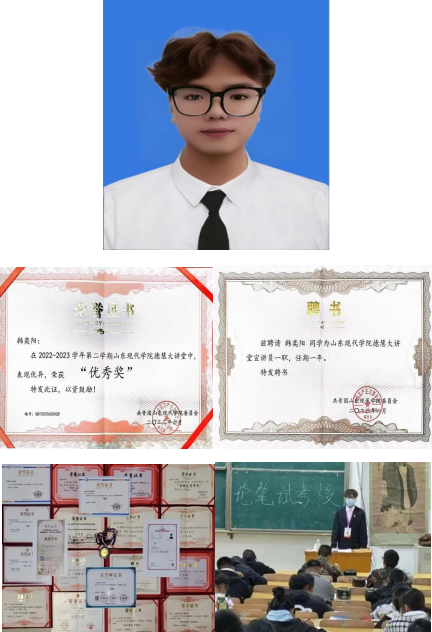 个人简介:韩奕阳,男,汉族,共青团员,2022级本科电子信息工程1班。在班里担任班长一职,同时在校团委组织部任职,多次参加学校组织的各类活动,曾获得“大学生职业生涯规划大赛”三等奖、“第十五届全国美誉教学展评”三等奖、“优秀大学生志愿者”“最美心灵现代学子”“校级优秀学生”等荣誉。
